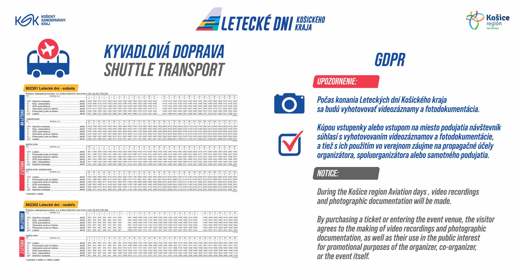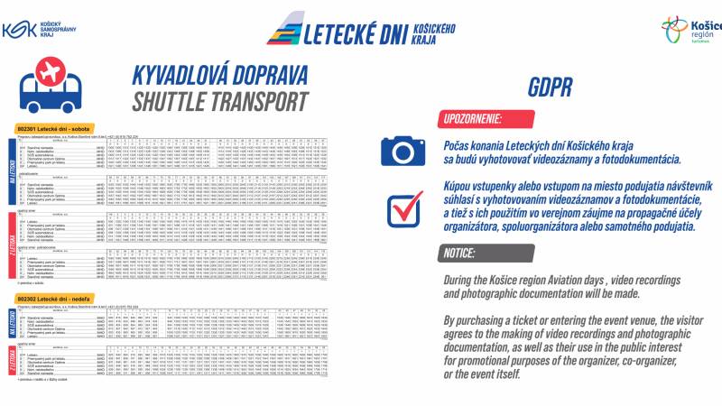 Usporiadateľ Leteckých dní Košického kraja 2025 (LDKK 2025) zabezpečil pre návštevníkov LDKK 2025 autobusovú linku, ktorá bude vychádzať zo zastávky Staničné námestie a bude zastavovať iba na vybraných zastávkach: Nám. osloboditeľov, SOŠ automobilová, Obchodné centrum Optima, Priemyselný park pri letisku. Výstup, resp. nástup návštevníkov na letisku bude na konečnej zastávke Letisko, teda na obratisku pred letiskovou halou.