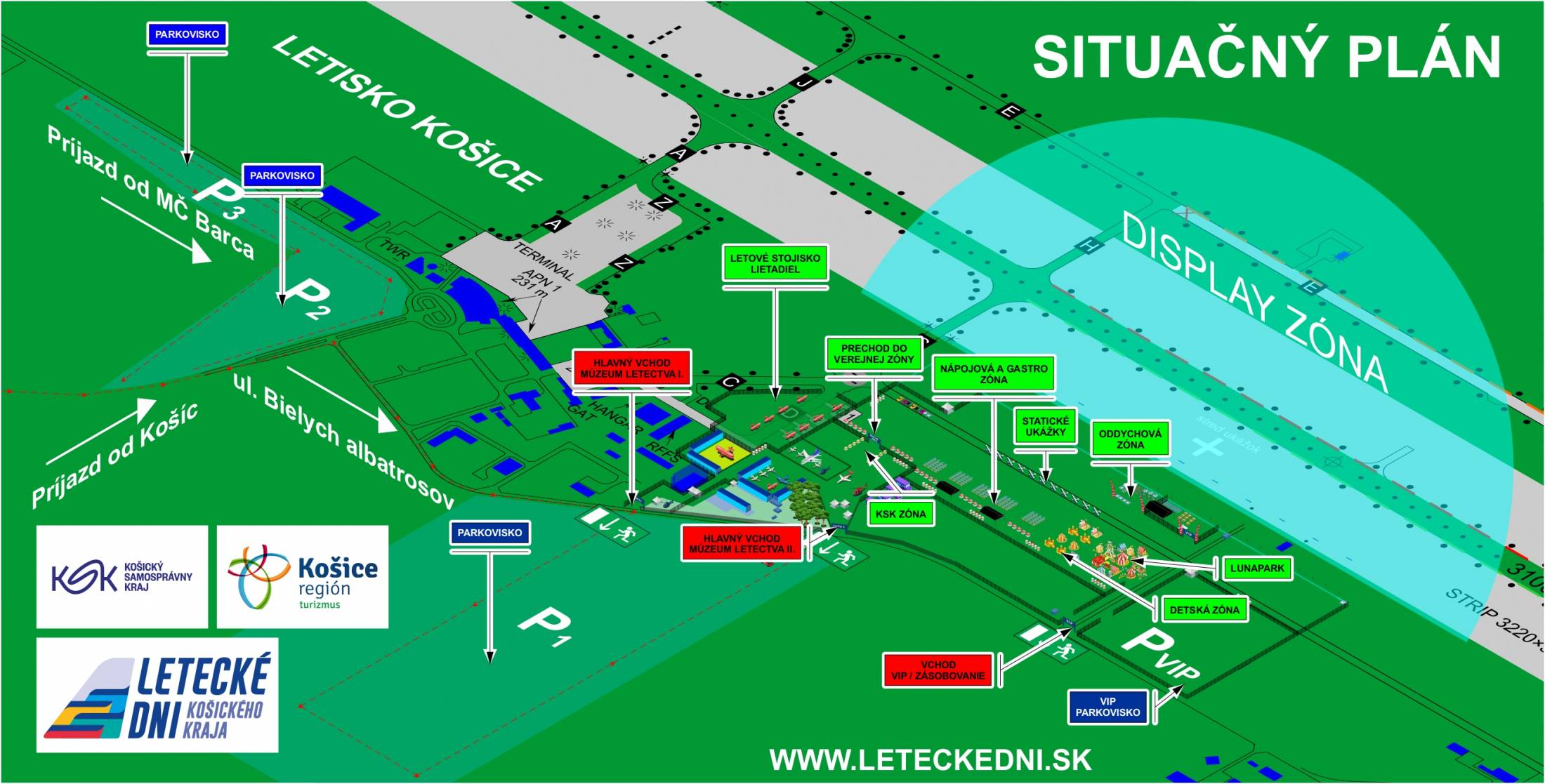 - Motorizovaní návštevníci prichádzajúci z južnej časti Slovenska zo smerov Rožňava – Lučenec – Zvolen, po ceste I. triedy č. 16, budú pokračovať v súlade s navigačným značením na letisko Košice, po ceste I. triedy č. 16 s následným odbočením na cestu III. triedy č. 3415, kde budú nasmerovaní na miestnu cestu, ulicu Bielych albatrosov, na parkovaciu plochu Parkovisko P1.